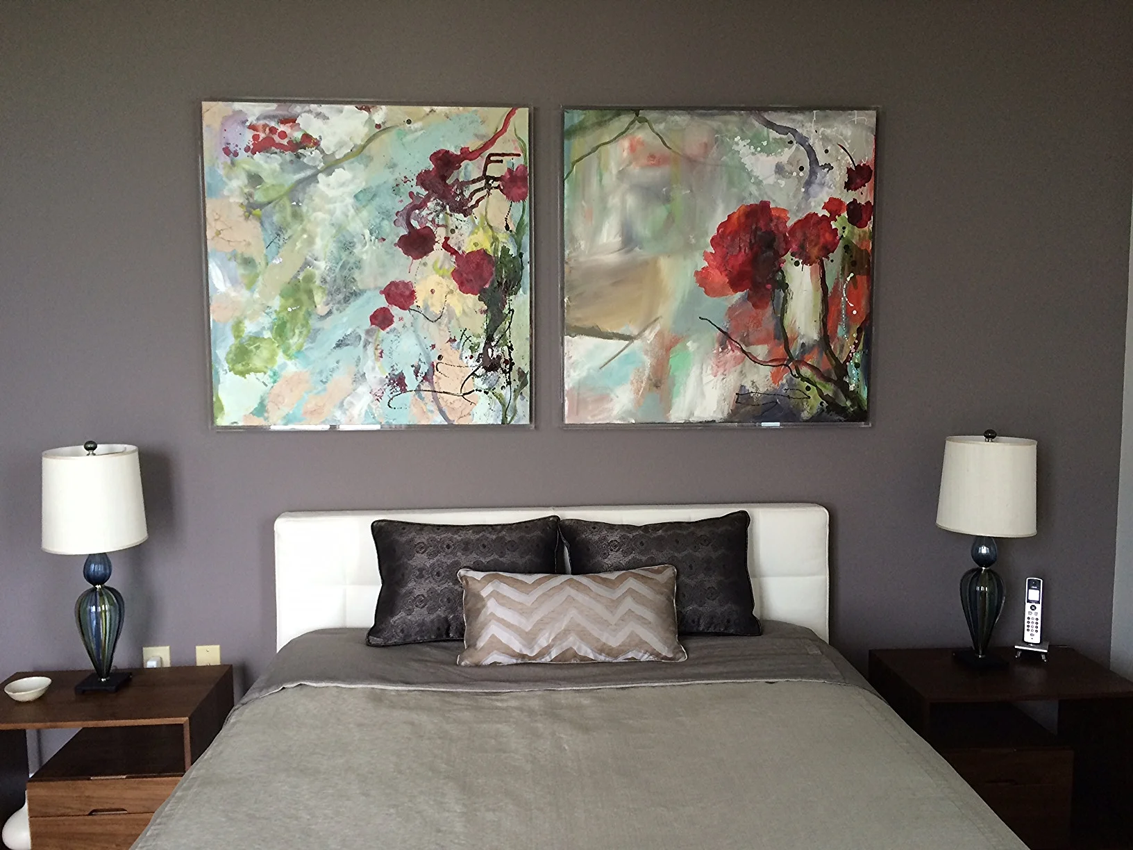 in love with our recent installation in a high rise overlooking downtown charlotte. a pair of paintings by windy o'connor popped on the darker wall color especially in the lucite frames. both paintings are from her new series entitled pulling weeds.